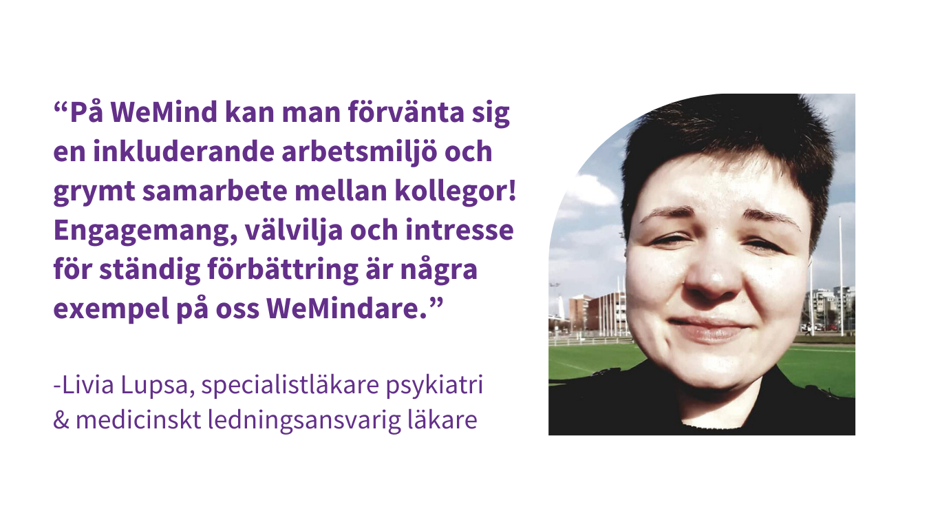 WeMind arbetar för psykisk hälsa och erbjuder vård och stödinsatser inom vuxenpsykiatri, BUP, HVB samt resurs- och behandlingsskola. Vi arbetar evidensbaserat, följer behandlingsresultat, är resursmedvetna och har alltid med ett vänligt bemötande. Vår viktigast byggsten är självklart våra medarbetare och tillsammans jobbar vi för att ständigt förbättra psykiatrin i Sverige och genom effektiv och jämlik vård och insatser gör vi skillnad på riktigt. Bli en av oss!